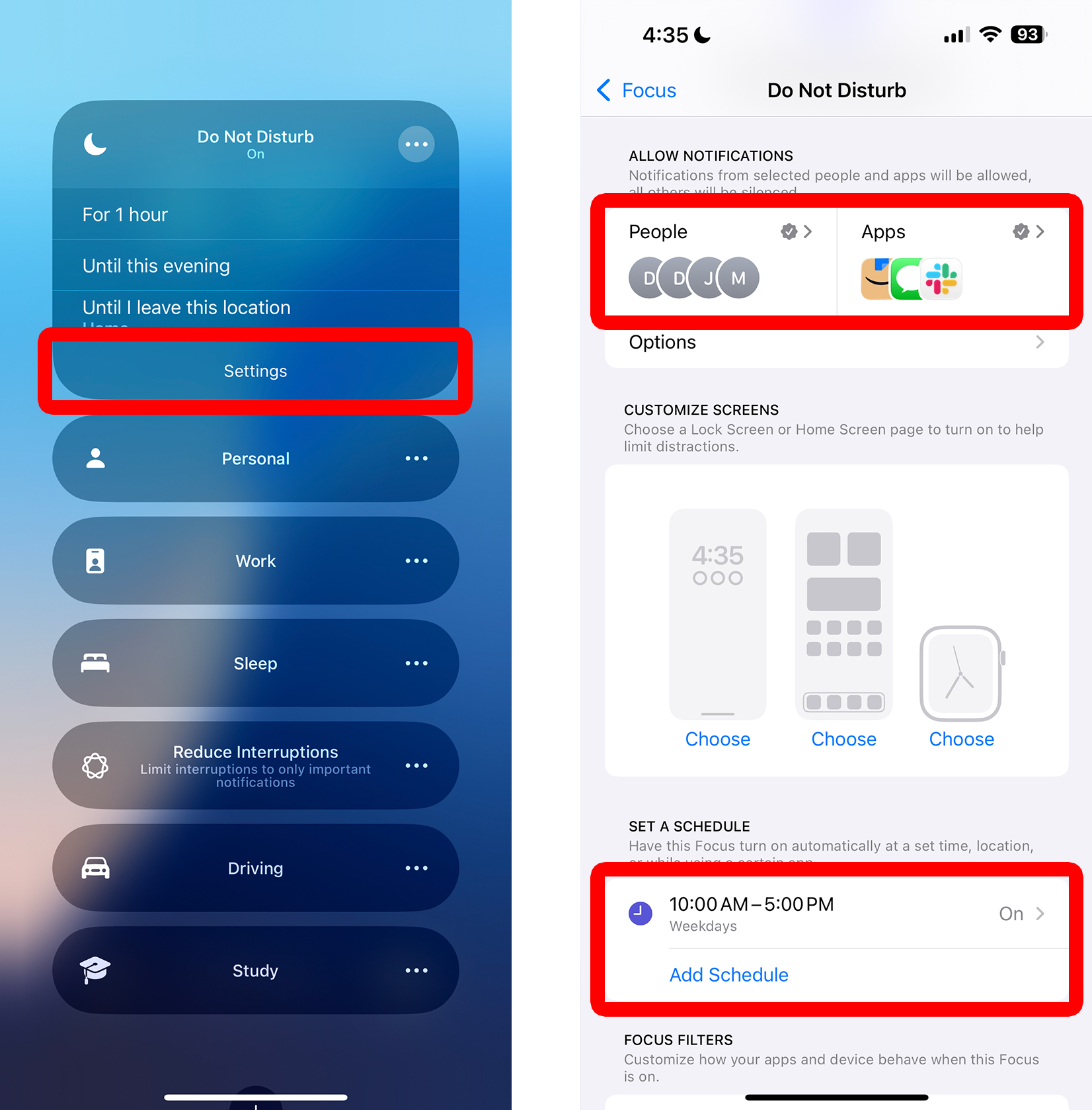 Tap “Settings” in the Focus menu to create custom schedules and filters: