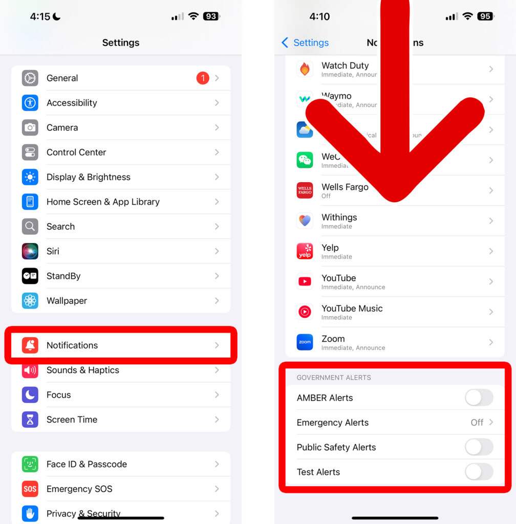 To turn off government alerts on your iPhone, go to “Settings > Notifications” and scroll all the way to the bottom of the page. From here, you can turn off “AMBER Alerts,” “Emergency Alerts,” “Public Safety Alerts,” and “Test Alerts.”